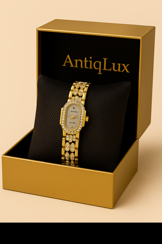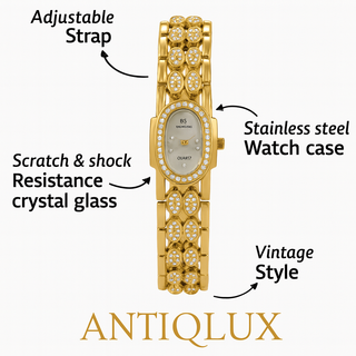 Adorned with hand-set crystals, a polished stainless steel case, and scratch-resistant crystal glass — this Antiqlux masterpiece embodies vintage allure and modern durability, made to shine beautifully for years to come.
